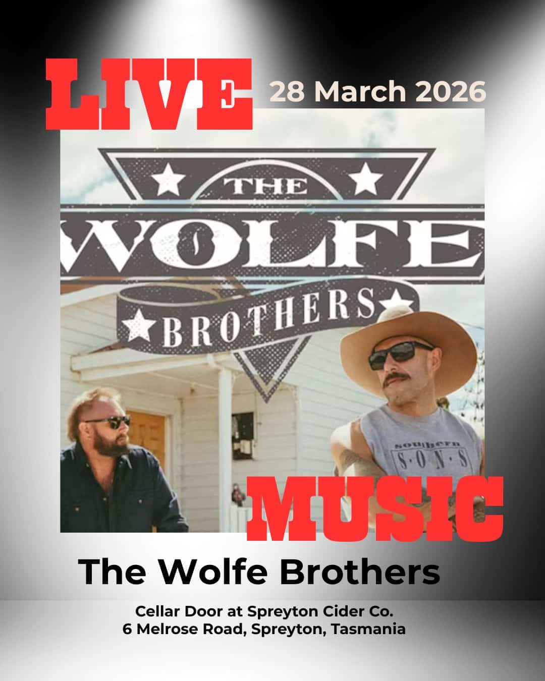 THE WOLFE BROTHERS, LIVE, SATURDAY 28 March 2026 at Spreyton Cider Co and 6 other live acts.