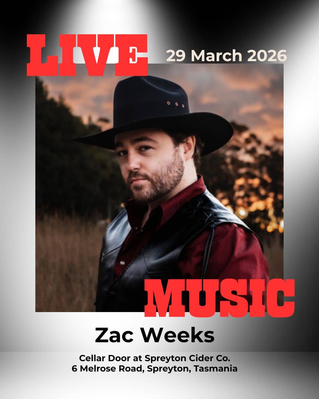FREE LIVE MUSIC: Zac Weeks Live – Sunday, 29 March 2026 from 2pm – 4.30pm at Spreyton Cider Co, 6