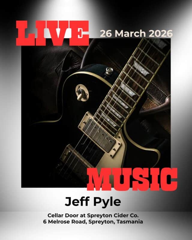 Jeff Pyle is playing live at Spreyton Cider Co, come join us for dinner and let the evening take care of itself from 4:30 – 7:30pm, Thursday, 26 March 2026.