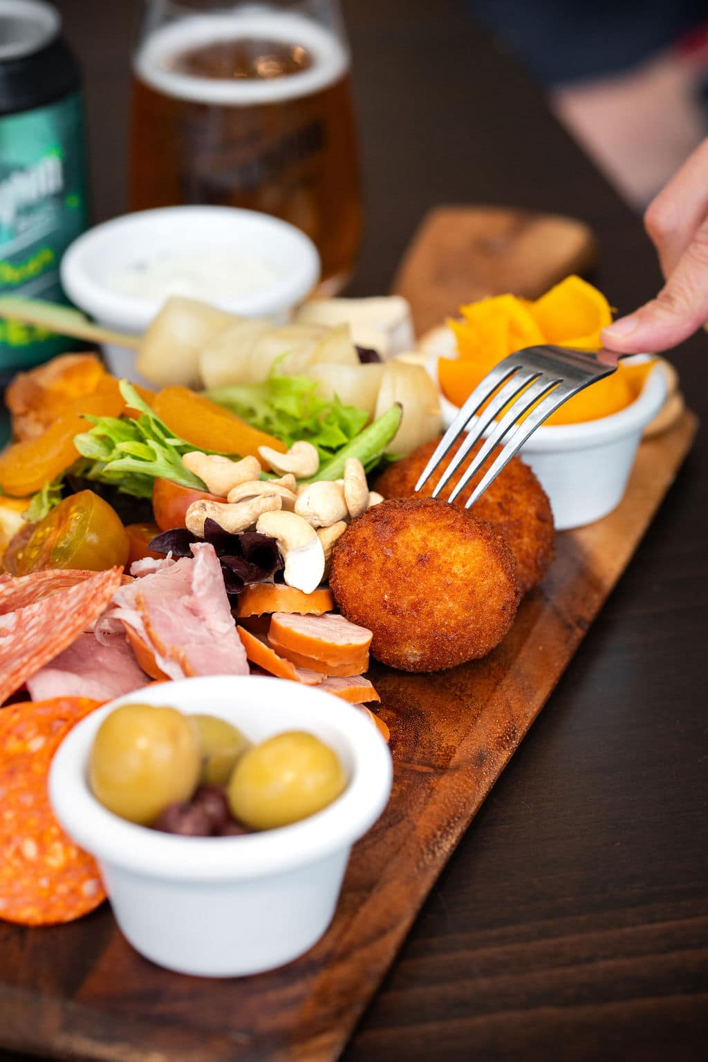 Selection of Tasmanian cheeses, arancini, marinated olives, cured meats, pickled onions, dip, leek tart, and crisp bread.