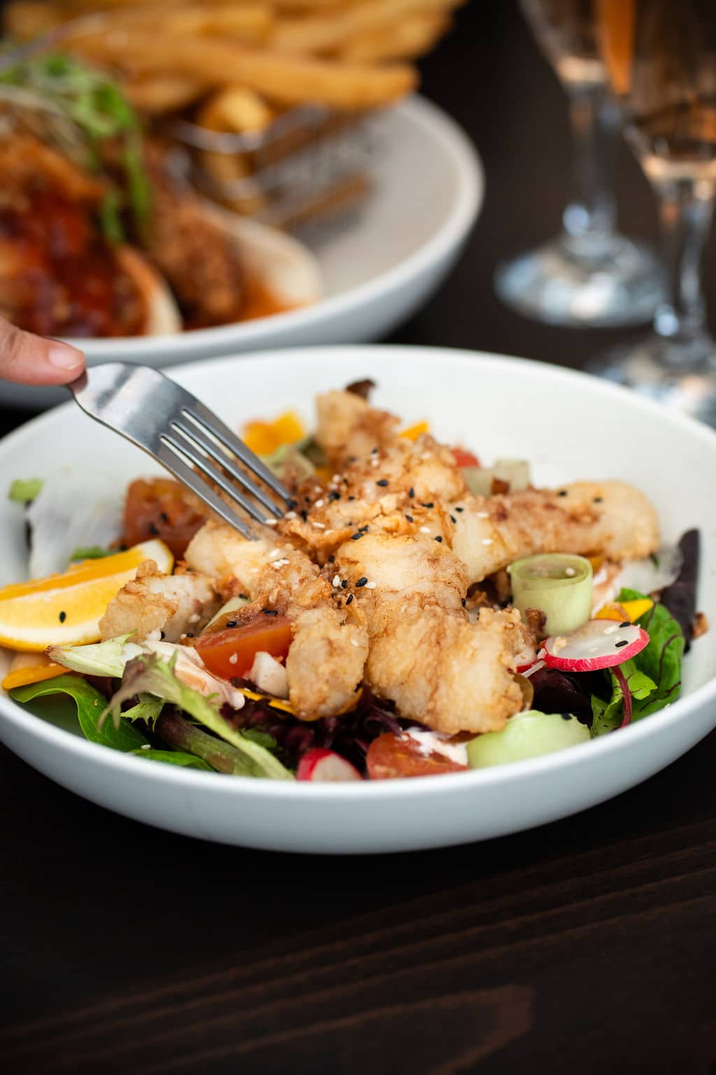 Tender squid atop a bed of lettuce, cucumber, fennel, tomato, radish, and aioli, topped with crispy shallots and cherry dressing.